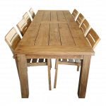 Deze set bestaat uit 1 * Robuuste Teakhouten tafel 300 cm en 8 * Harti Teak Tuin stapelstoelen