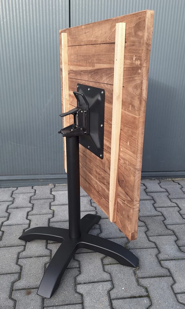 - Ruimtebesparend kantelmechanisme: De tafel is voorzien van een stevig aluminium onderstel met een ingenieus kantelmechanisme. Wanneer de tafel niet in gebruik is, klapt u het blad eenvoudig verticaal, waardoor u aanzienlijke opslagruimte bespaart.