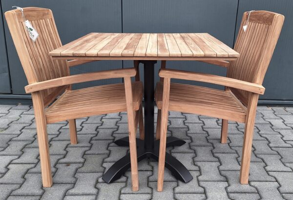 Het vierkante blad van 70 × 70 cm past perfect in kleinere buitenruimtes, knusse terraszitjes of praktische horeca-opstellingen.