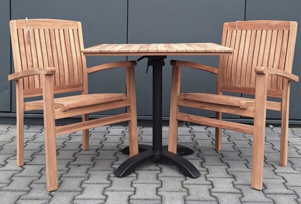 Het vierkante blad van 80 × 80 cm past perfect in kleinere buitenruimtes, knusse terraszitjes of praktische horeca-opstellingen.