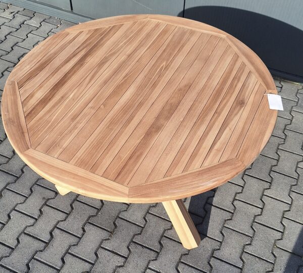 Tuintafel: 120 cm doorsnede en 74 cm hoog.