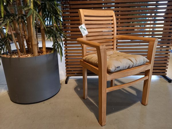 Optioneel is er ook de Hartman Havana jute zitkussen, een mooi formaat zitkussen voor in de teak tuin stapelstoelen. De maat van het zitkussen is B 45 x 45 x 5 cm. De Havana Jute kleur past heel goed bij het warme teakhout. Een dikke tuinkussen en heel comfortabel. De dikte van 5 cm past ook goed bij de uitstraling van de teak stapelstoel. Voor een diepe uitstraling is de Hartman havana dark grey een geschikte zitkussen vanwege het contrast met dark grey en het warme teak.